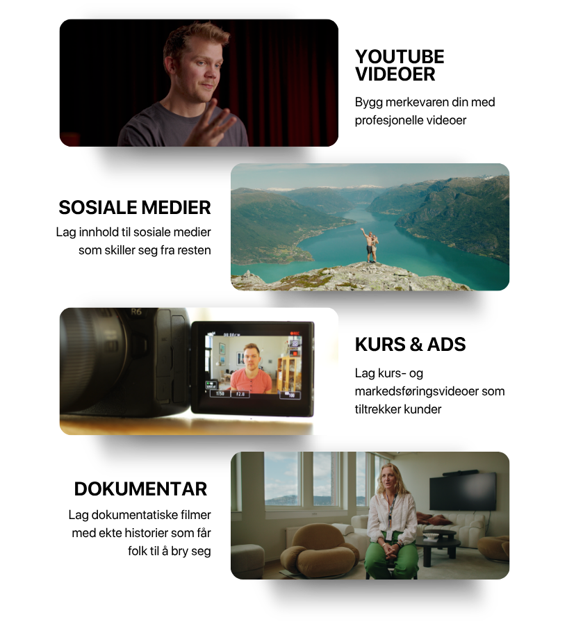 Å gi deg en tydelig plan for å lære videoproduksjon dag for dag, steg for steg. Sånn at du kan produsere profesjonelle videoer som bygger merkevaren din, selger mer av produktet ditt, tiltrekker kunder, eller for å dyrke en ny hobby. LAG VIDEO har alt du trenger.